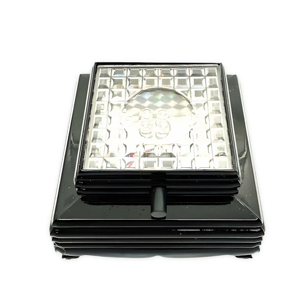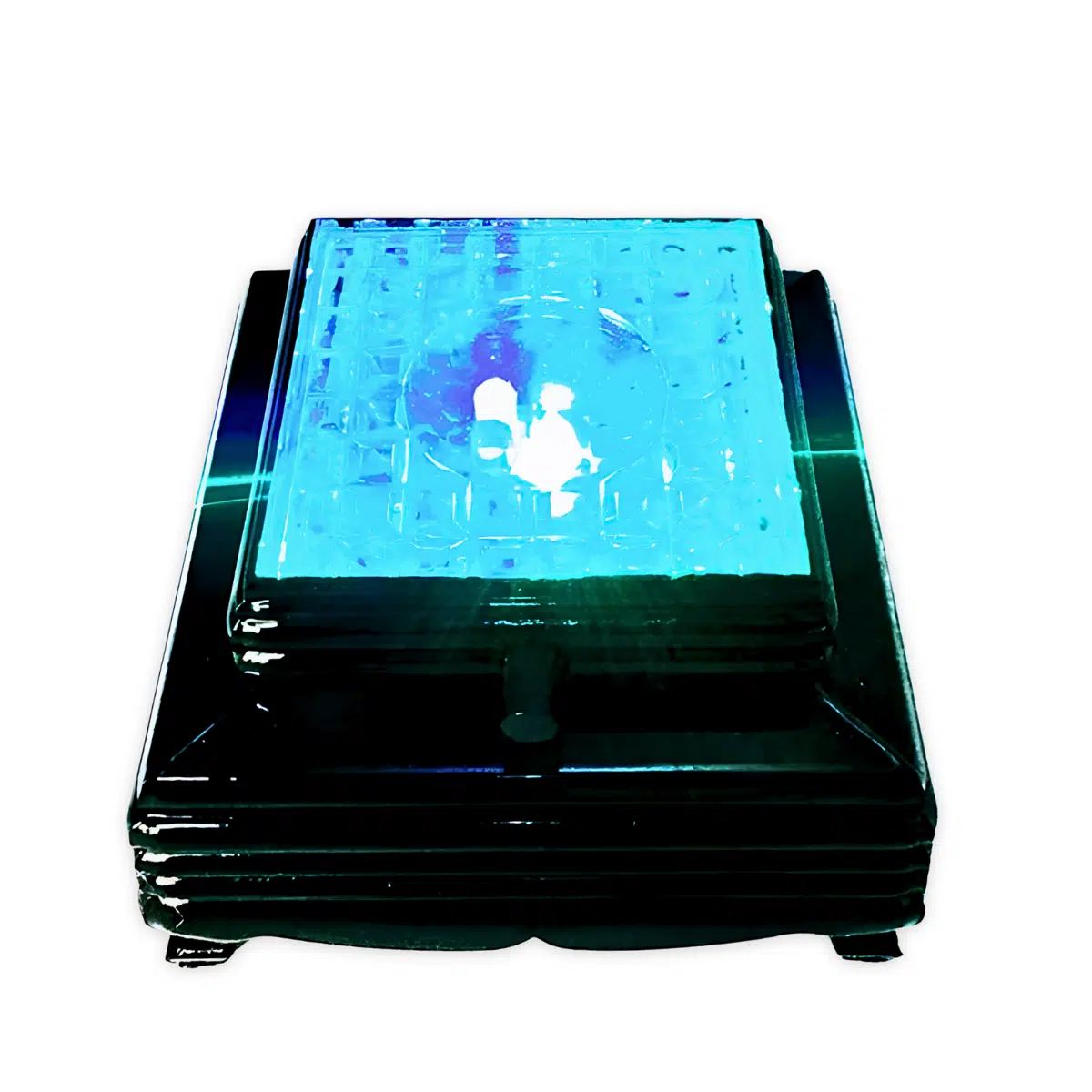 Kompakte, quadratische Präsentationsbasis mit schwarzem Stufensockel und transparenter, gemusterter Oberplatte. Die Basis wird mit Batterien betrieben und benötigt 3 × AA-Batterien (nicht im Lieferumfang enthalten). Ein zentrales Licht leuchtet nach oben und setzt Kristalle, Glasdekore oder kleine Figuren in Szene, sodass Details und Reflexionen in Vitrinen, Schaufenstern oder Wohnräumen besser zur Geltung kommen.