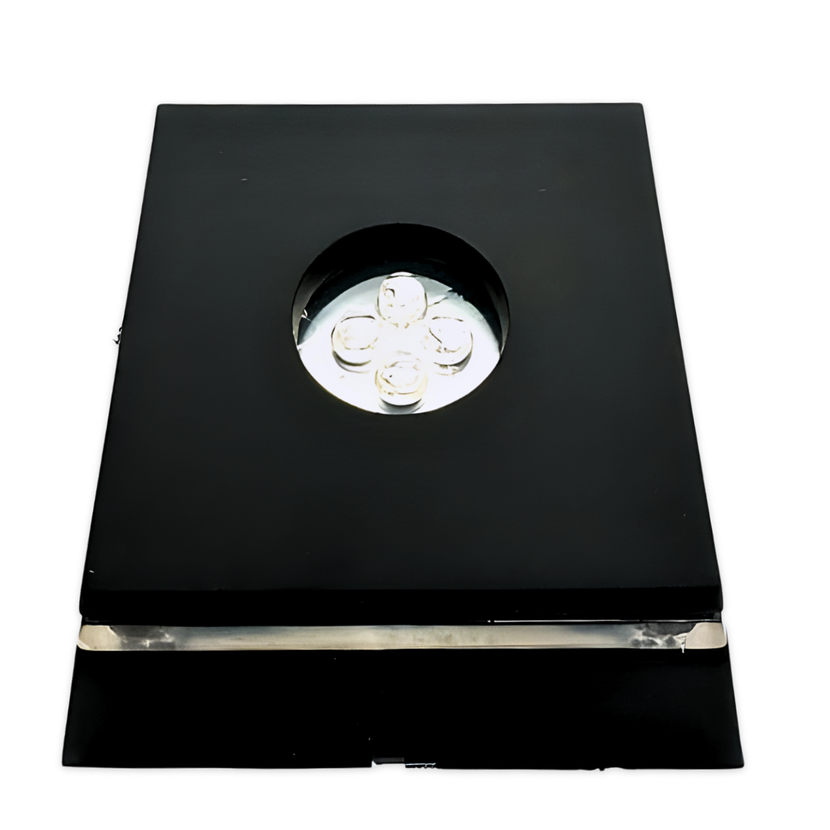 Flache, quadratische Präsentationsbasis mit schwarzem Gehäuse, zentralem LED-Cluster und einem umlaufenden Lichtstreifen. Die nach oben und zur Seite gerichteten LEDs erzeugen einen hellen, farbwechselnden Effekt, der aufgestellte Kristalle, Glasdekore oder kleine Figuren betont und Gravuren sowie Facetten in Vitrinen oder zu Hause besser sichtbar macht. Die Basis wird mit Batterien betrieben und benötigt 3 × AAA-Batterien (nicht im Lieferumfang enthalten), sodass sie flexibel ohne Steckdose platziert werden kann.
