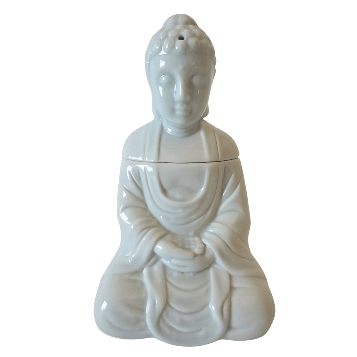 Keramischer Duftölbrenner in Form eines sitzenden Meditations-Buddhas, mit glänzender weißer Glasur.